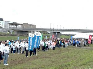 当日は、約1,000名の参加者の皆様とともに、北九州市の水源である遠賀川の清掃活動に取り組みました。